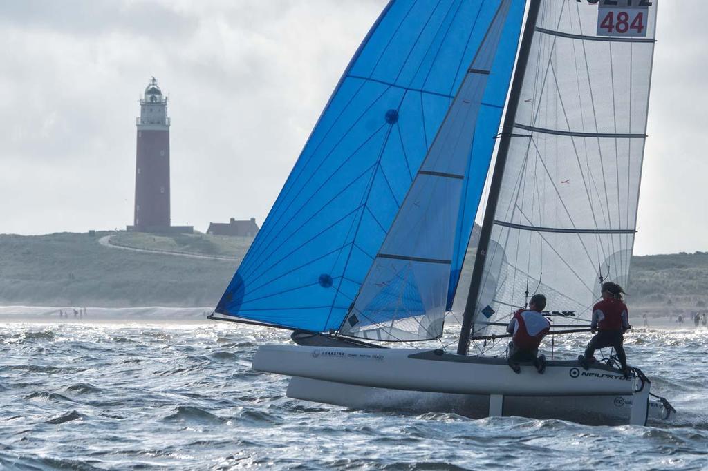 The honour of 'first finisher' of the Round Texel last Saturday went to the team of Peter Vink and Mischa de Munck. On a Nacra 20 catamaran with modified daggers and rudders they 'flew' over the water. But the Round Texel is sailed in accordance with the so-called Texel Rating handicap system. That is a value used to calculate your adjusted time, so different types of cats can compete with each other. Bigger and smaller cats. Vink and De Munck sailed with a rating of 87, while the winner was expected to come from the smaller Formula 18 cats or the Olympic Nacra 17 class. And Visser and Van der Velden lived up to that expectation.