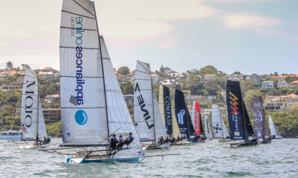 Race 2 of the 18 Footers Australian Championship got away Sunday, January 21, 2017 in a 9knot east-nor-easter. The fleet were eager to get started with a number of boats over the line early. Simon Nearn, Grant Rollerson and Niall Kinch on De’Longhi got won the start on the port end of the line and didn’t let up from there.