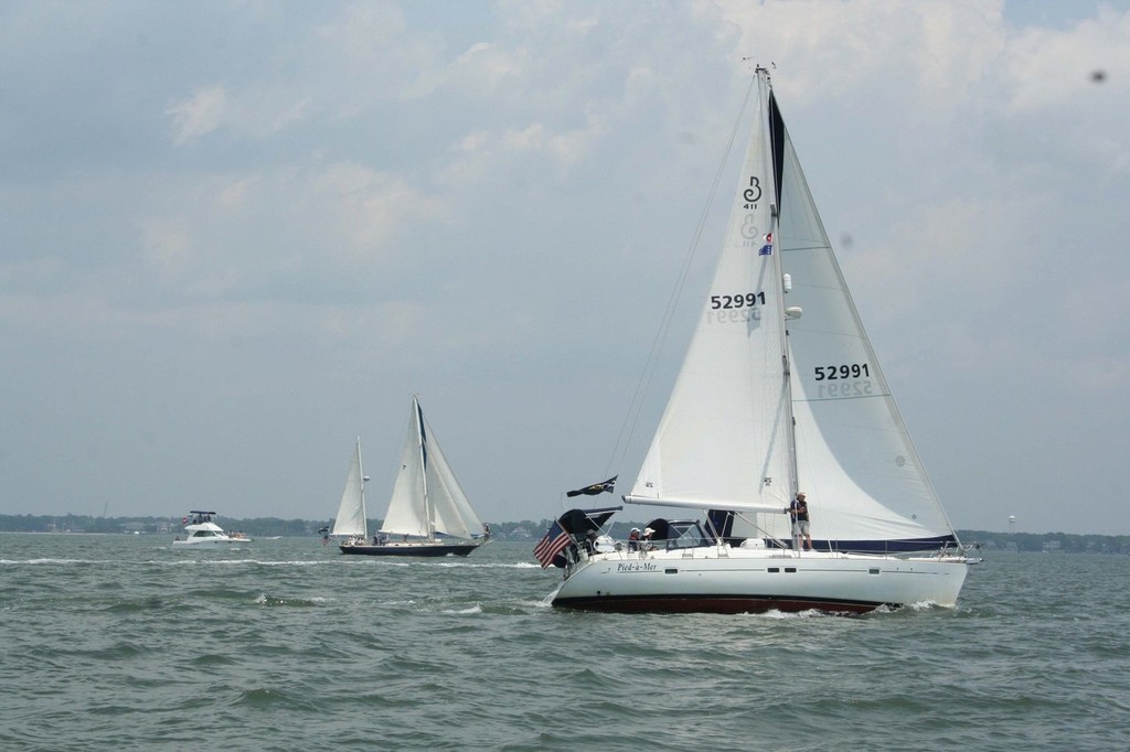 Competitors were greeted with bright blue, low country skies and freshening southeast winds out on Charleston Harbor as the 11 boats competing in this biennial contest amassed for the start. Some 50-odd spectator boats were on hand to cheer on the fleet, with a few of them carrying signs for the racers.