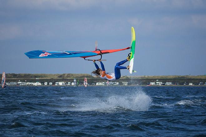 Antoine Albert from New Caledonia landed a perfect skopu which became his signature tow-in move over the past seasons. Julien Mas spun through a stylish triple funnell but couldn’t land the funnell-burner he was aiming for in his second run. Vladimir Yakovlev (JP/Neilpryde) looked very confident in training and also his runs and qualified with a clean one-handed burner. Yentel Caers could secure his place with an air-funnell burner. The ten riders for Sunday are completed by Francesco Cappuzzo (spock) and Rafael de Windt (double funnell).