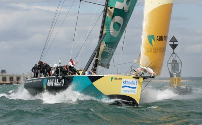 No records were broken today when Class 0 contested the Britannia Cup with a race around the Isle of Wight, but Mike (Moose) Sanderson and his Volvo Ocean Race winning boat ABN Amro crossed the finishing line 8 minutes behind ICAP Maximus, but beat her on corrected time by 26 minutes to collect the trophy.