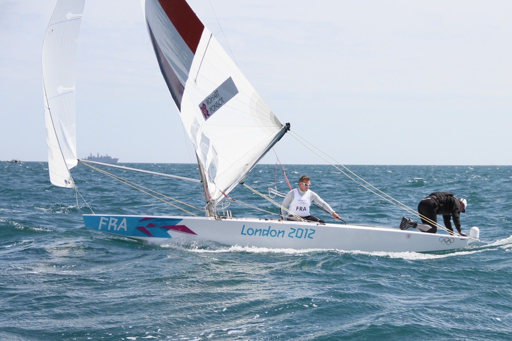 The French Star crew free the mainsheet wrapped around a stern camera on the Practice Day for the 2012 Olympics Richard Gladwell