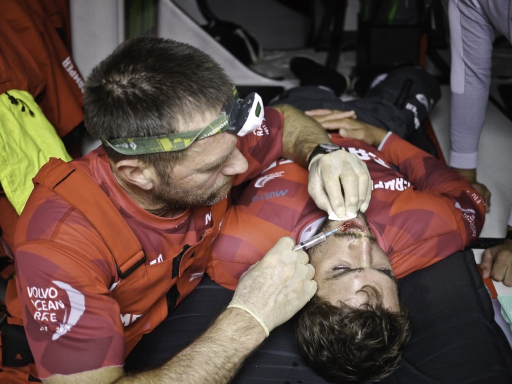 Mike suffered a broken tooth, gash to the face and various bumps and bruises in the fall. He was stabilised immediately by onboard medic Tony Rae (Trae) and after further medical advice from Volvo Ocean Race Headquarters has received three stiches and the affected tooth area has been anesthetised.
