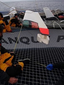 Last night the wind dropped, unfortunately for our lead over Groupama, but it has given us perfect conditions to extract the 600kg board and start repairs: Yvon and Pym are doing an outstanding job and are going to be working through the night: The broken bits are now cut off and a complex capping needs to be put in place over the cut end to withstand 40 knots of boatspeed.