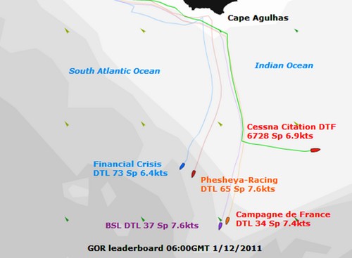 By 13:00 GMT, the Franco-British duo of Halvard Mabire and Miranda Merron had moved into the lead with Campagne de France, rounding Cape Agulhas at the southern tip of Africa, entering the Indian Ocean with Cessna Citation and BSL hard on the chase under one mile astern. As the south-easterly breeze began to build, the leading trio dropped south on port tack away from land while a duel continued 20 miles behind the leaders between the South African duo of Nick Leggatt and Phillippa Hutton-Squire in fourth on Phesheya-Racing and the Italian-Spanish team of Marco Nannini and Hugo Ramon in fifth on Financial Crisis with the two Class40s separated by just six miles.