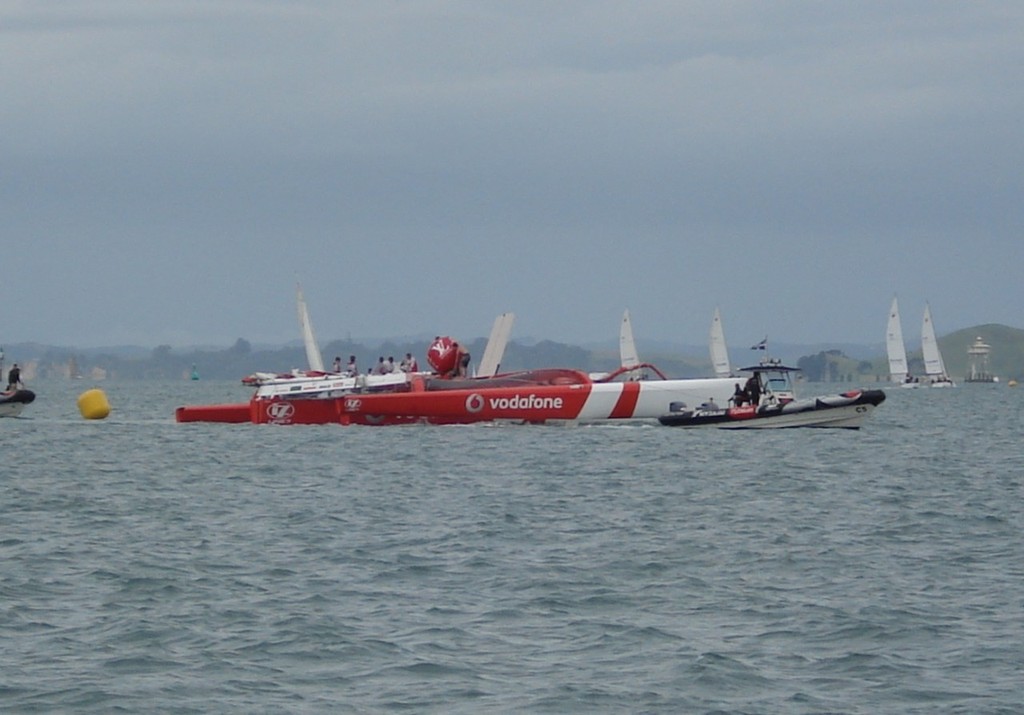 Dismasted Team Vodafone Sailing with ETNZ tenders assisting - Team Vodafone Sailing Colin Preston