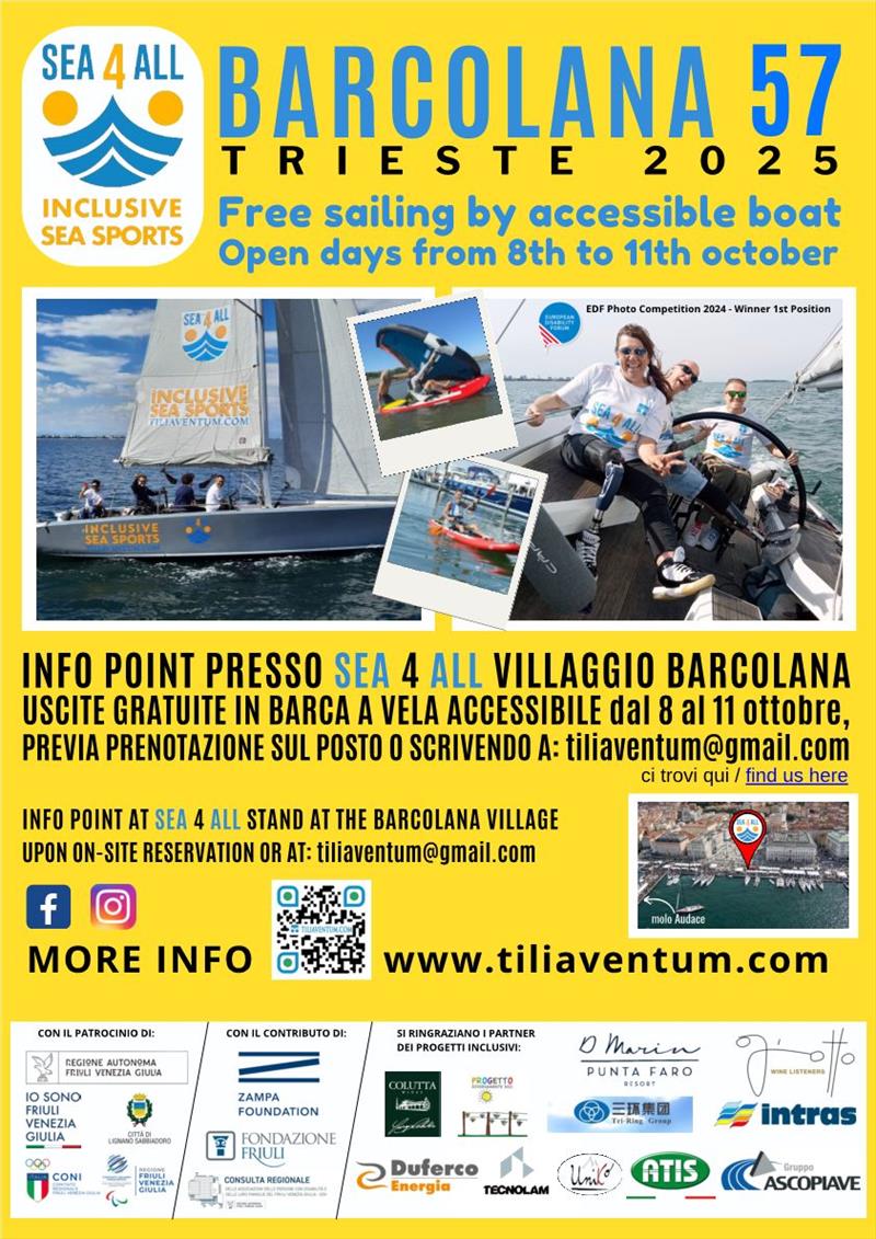 Barcolana 57 (the famous Regata in Trieste, Italy) for everyone and by everyone with Sea4All initiatives by Tiliaventum. Crew sailing in Trieste from October 5 to 11 and Regatta on Sunday 12 aboard accessible boats... when the sea, sun, wind, sport, sailing, and celebration are for everyone and by everyone.