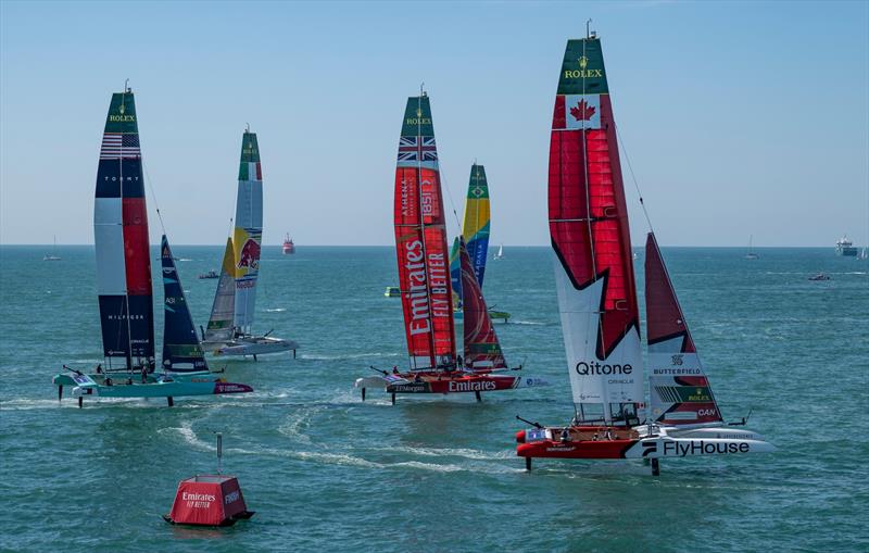 Canada NorthStar SailGP Team helmed by Giles Scott ahead of Emirates Great Britain SailGP Team and USA SailGP Team on Race Day 1 of the DP World Spain Sail Grand Prix held in Cadiz, Spain © Jason Ludlow for SailGP