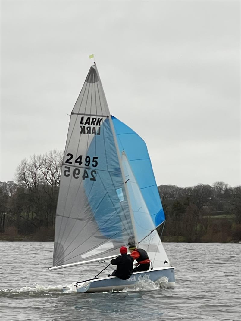 A good beat to Y under the dam and James Goss was first in the Merlin, followed by Stuart Hydon in the Lark. These two sailed away from the rest of the fleet with Stuart visibly planing at times and the Merlin not quite lifting. This enabled Stuart to keep a visible distance on the Merlin and eventually led to his victory of the Merlin on corrected time of some two minutes. The wind actually dropped quite a lot in the middle of the race and was also stubborn to change to the Southerly as predicted.