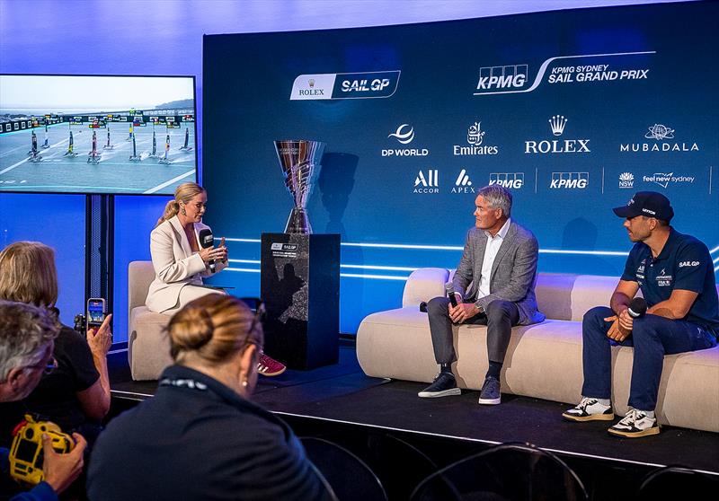 Fox Sports Sam Squiers with Russell Coutts and Quentin Delapierre at the media conference - KPMG Australia Sail Grand Prix - Sydney - February 27, 2026 © Andrew Baker/SailGP