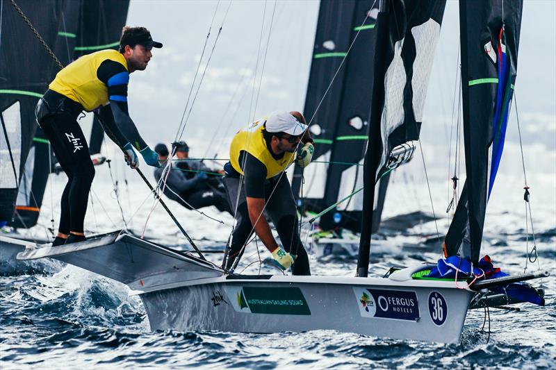 In the 49er Skiff class the lead has alternated between top duos from the USA and Australia who spent time training together within a big group working out of Torbay, north of Auckland. After today's three Elimination Series races it is Sydney's Harry Price and Max Paul who are into their second season together who lead by three points. The pair joined up as friends and champions from the same 18ft Skiff, Price confirming they have come a long way since last year's Sofía where they finished 31st.