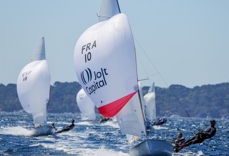 Surely only in Hyères can this amount of Champagne and Olympic sailing have been consumed in a week. There was fine racing on all six days and you could not have designed better conditions for race courses nor more beautiful surroundings between the Giens peninsula and the Îles d'Or. The forecast westerlies arrived early and the Nacra 17, 49er and FX finals began at 10.30 in 15 knots and a gently rippling sea state. The wind built towards 18 knots when the 470, ILCA 6 & ILCA 7 went out an hour later.
