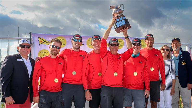 Ficker Cup 2026 - LBYC Commodore Bob Piercy (far left), Deon McDonald and Ficker Cup Chair Tom Camp (far right) congratulate Skipper Scotty Dickson (holding trophy), Steve Flam, Garrett Brown, Danny Bailey, Jackson McCoy, and Tony Stuart © Bronny Daniels / LBYC